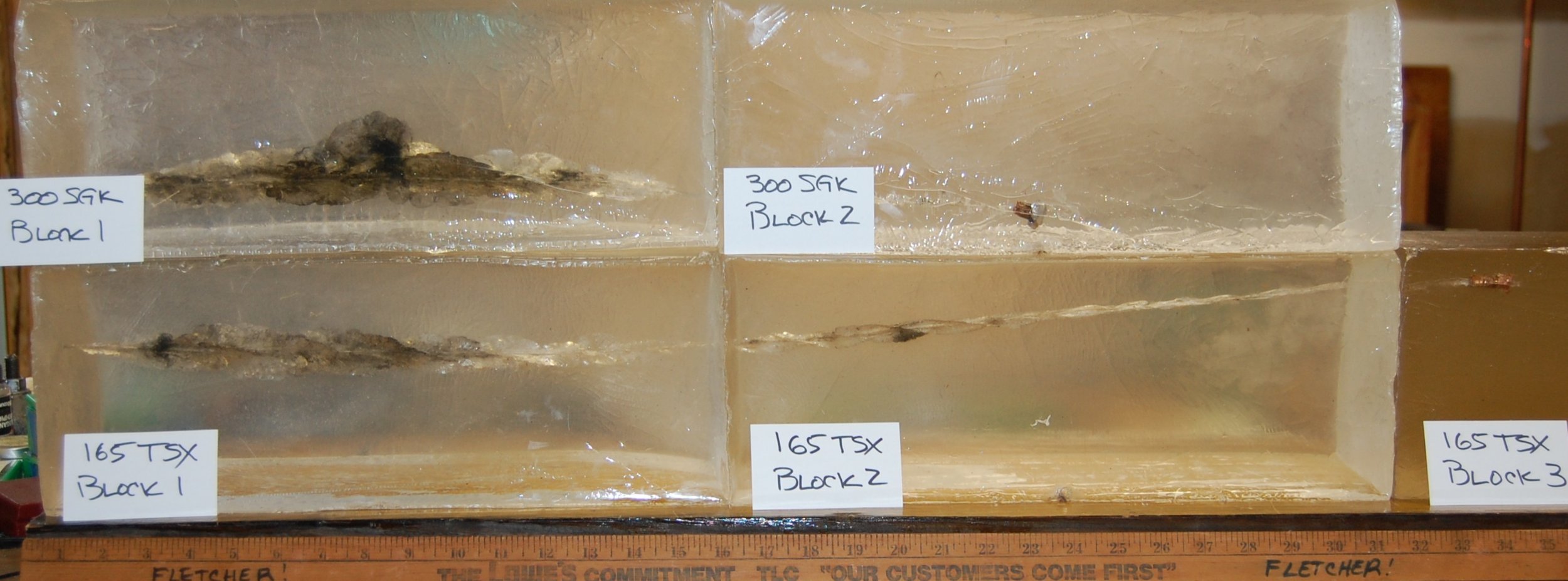 The synthetic gel blocks shown in the photo above depict the relic “Guppy” shape of the fracture array caused by passage of a test bullet. The extent of these fractures simulates (models) the wound cavity produced in an animal, including the extent of bloodshot tissue. Guppy metrics referenced to this generalized shape can be found by clicking on the “Guppy Model” tab found on this page’s header. Mathematical definitions of these metrics can be found by clicking on the “Guppy Tech” tab also found on this page’s header.